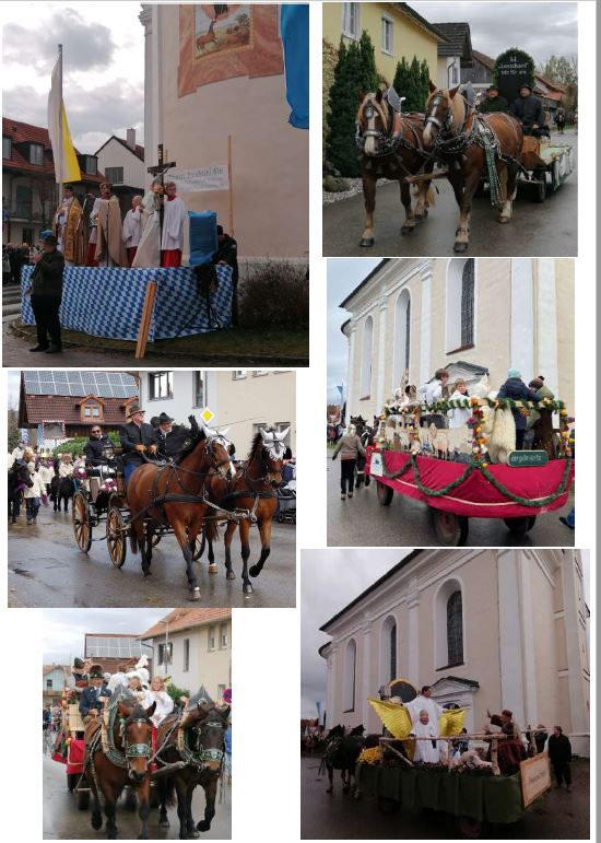 Anschließend fand die Pferdesegnung und der traditionelle Leonhardiritt um die Kirche mit vielfältig gestalteten Wägen und zahlreichen schön geschmückten Pferden statt. Auch unserer Ministranten hatten einen Wagen mit dem Thema „Der gute Hirte“ gestaltet.