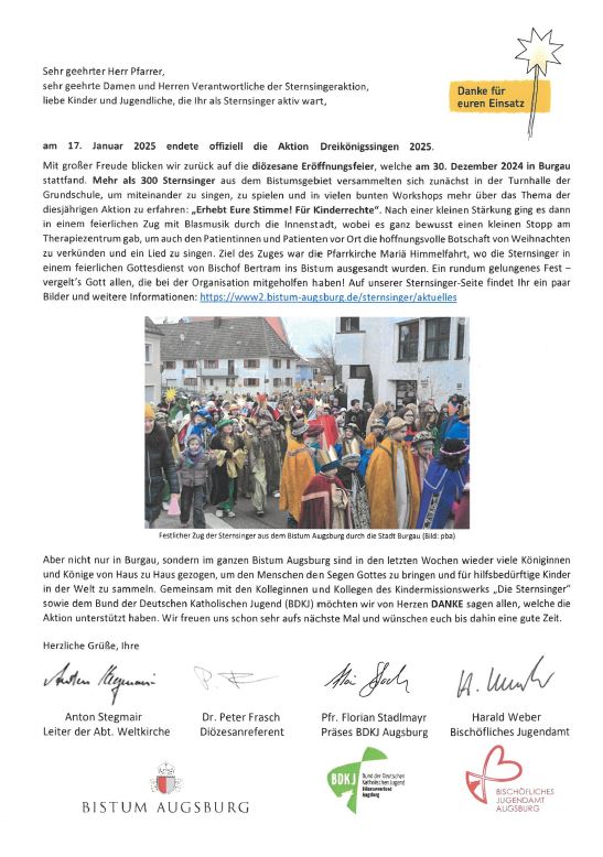Vorläufige Ergebnisse der Sternsinger Aktion 2025 (Stand 05.02.2025):