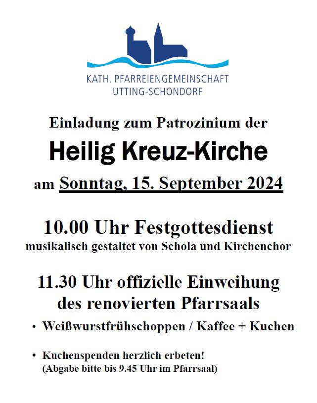 Am Sonntag, 15. September, findet um 10 Uhr in der Kirche Hl. Kreuz in Schondorf ein Patroziniums-Gottesdienst statt. Musikalische Mitgestaltung: Schola und Kirchenchor.