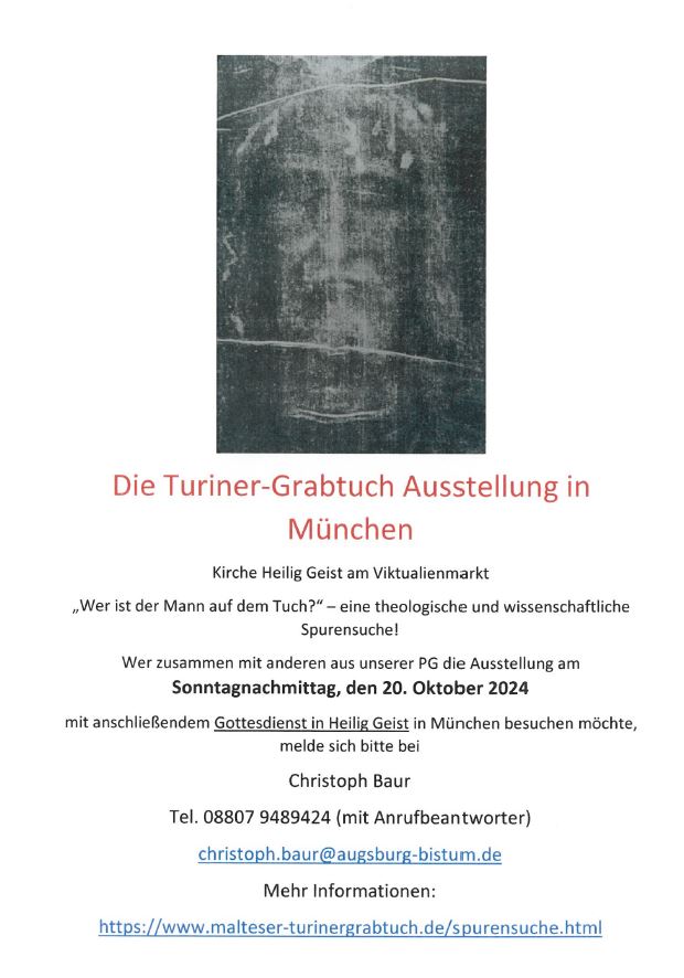 Wer zusammen mit anderen aus unserer PG am Sonntagnachmittag, den 20. Oktober 2024, die Ausstellung des Turnier Grabtuchs in der Kirche Hl. Geist am Viktualienmarkt in München besuchen möchte, melde sich bitte bei Herrn Christoph Baur: 08807 / 9489424 oder christoph.baur@bistum-augsburg.de