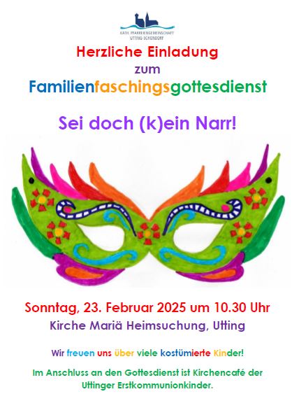 Einladung zum Familiengottesdienst zum Fasching am 23. Februar 2025 um 10:30 Uhr in der Kirche Mariä Heimsuchung. Die Kinder dürfen gerne verkleidet kommen. Anschl. findet ein Kirchencafe der Uttinger Erstkommunionkinder statt. |