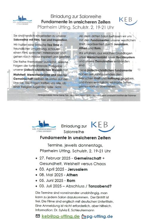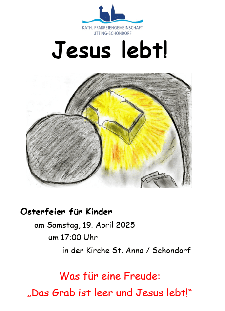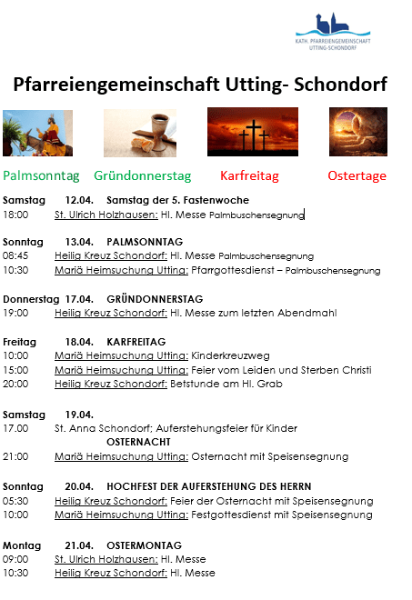 Donnerstag 17.04. GRÜNDONNERSTAG 19:00 Heilig Kreuz Schondorf: Hl. Messe zum letzten Abendmahl Freitag 18.04. KARFREITAG 10:00 Mariä Heimsuchung Utting: Kinderkreuzweg 15:00 Mariä Heimsuchung Utting: Feier vom Leiden und Sterben Christi 20:00 Heilig Kreuz Schondorf: Betstunde am Hl. Grab Samstag 19.04. 17.00 St. Anna Schondorf; Auferstehungsfeier für Kinder OSTERNACHT 21:00 […] |