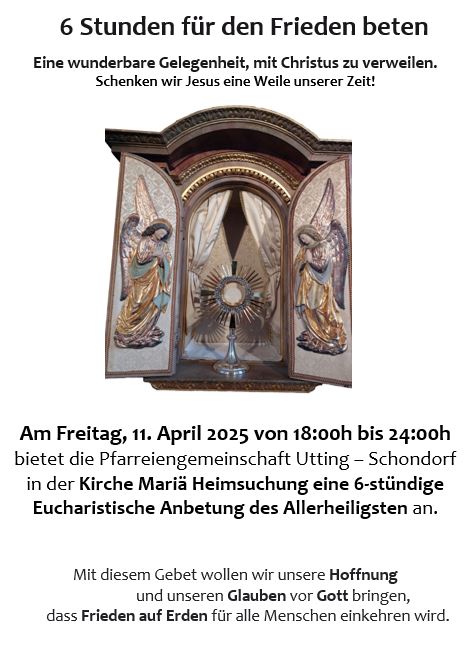 Am Freitag, den 11. April von 18 bis 24 Uhr wird eine 6-stündige eucharistische Anbetung in der Kirche Mariä Heimsuchung in Utting angeboten. Bitte tragen Sie sich in die in den Kirchen ausliegenden Listen ein. Eine wunderbare Gelegenheit mit Christus zu verweilen und für den Frieden zu beten. Schenken wir Jesus eine Weile unserer Zeit. |