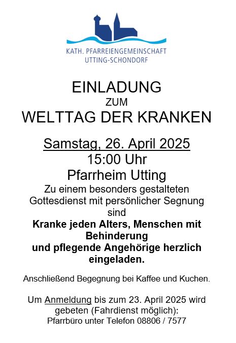 Am Samstag, 26. April 2025 um 15 Uhr sind Kranke jeden Alterns, Menschen mit Behinderung und pflegende Angehörige herzlich zum Gottesdienst mit persönlicher Segnung ins Pfarrheim Utting eingeladen. Anschließend ist Zeit für Gespräche bei Kaffee und Kuchen. Bitte Anmeldung bis 23. April im Pfarrbüro. Ein Fahrdienst wird angeboten. |