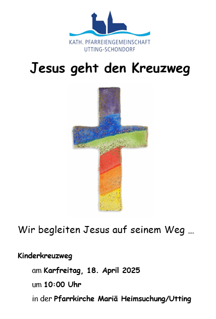 Am Freitag, 11. April um 17 Uhr wird zur Kreuzwegandacht in die Kirche Mariä Heimsuchung in Utting eingeladen. Die Messe um 9 Uhr entfällt an diesem Tag.