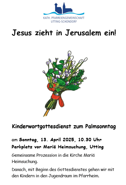 Palmweihe am Parkplatz des Pfarrheims in Utting mit Prozession zur Kirche Mariä Heimsuchung, anschl. Hl. Pfarrgottesdienst. Parallel zur Messe findet ein Kindergottesdienst statt. Die Kinder gehen gemeinsam rüber ins Pfarrheim. Es werden Palmbuschen gegen Spende ausgegeben. |