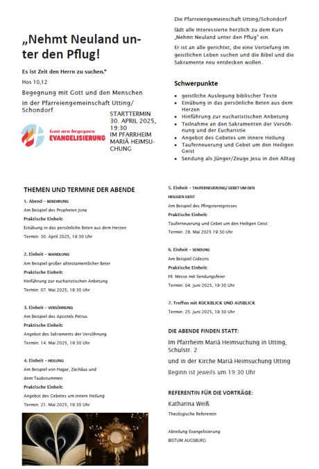 An den Pfingsttagen finden folgende Gottesdienste statt: Sonntag, 8. Juni 2025 PFINGSTEN - HOCHFEST DES HEILIGEN GEISTES 9.00 Uhr Utting Mariä Heimsuchung Pfarrgottesdienst 10.30 Uhr Schondorf Heilig Kreuz Hl. Messe, musikalische Mitgestaltung durch den Kirchenchor Schondorf Montag, 9. Juni 2025 PFINGSTMONTAG 10.00 Uhr […] |