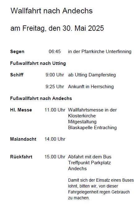 Wallfahrt nach Andechs mit der Pfarreiengemeinschaft Windach am Freitag 30. Mai 2025 Abfahrt des Dampfers um 9 Uhr am Dampfersteg Utting. Fußwallfahrt nach Andechs. 11 Uhr Wallfahrtsmesse in der Klosterkirche. 14 Uhr Maiandacht. 15:00 Rückfahrmöglichkeit mit dem Bus. |