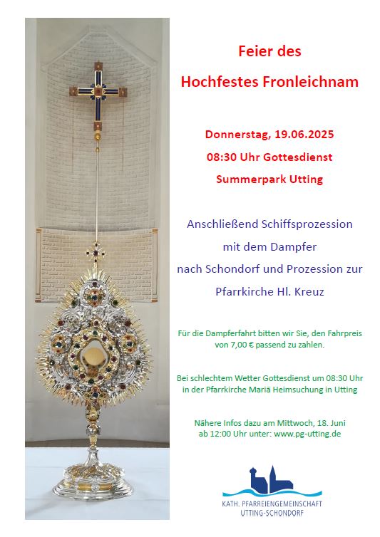 08:30 Uhr Gottesdienst im Summerpark Utting, anschl. Schiffsprozession mit dem Dampfer nach Schondorf und Prozession zur Pfarrkirche Hl. Kreuz. Für die Dampferfahrt bitten wir Sie, den Fahrpreis von 7,00 € passend zu zahlen. Bei schlechtem Wetter Gottesdienst um 08:30 Uhr in der Pfarrkirche Mariä Heimsuchung in Utting. Nähere Infos dazu am Mittwoch, 18. Juni ab […] |