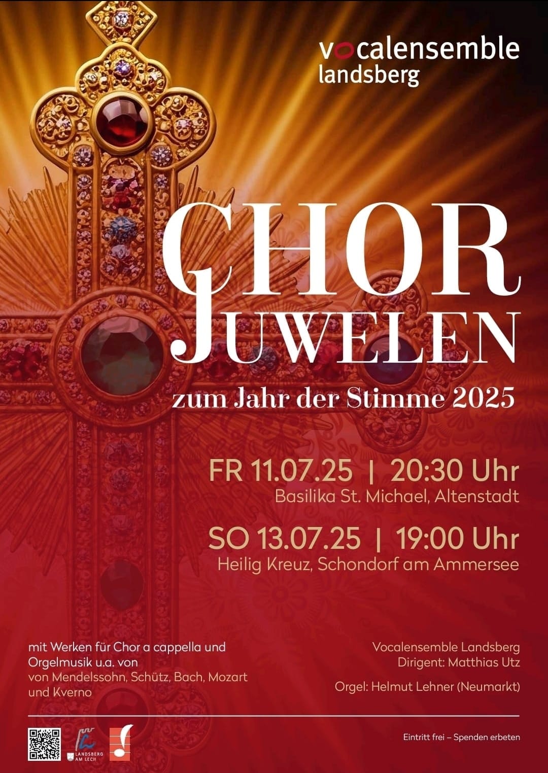 Der deutsche Musikrat hat für das laufende Jahr das „Jahr der Stimme“ ausgerufen. Aus diesem Anlass veranstaltet das Vocalensemble Landsberg, Preisträger internationaler Chorwettbewerbe, unter der Leitung von Matthias Utz ein festliches Chorkonzert unter dem Motto „Chorjuwelen“. Es erklingen epochenübergreifend Werke von Schütz, Bach bis hin zu Mendelssohn, Verdi und Kverno. Abgerundet wird das klangvolle Chorkonzert […] |