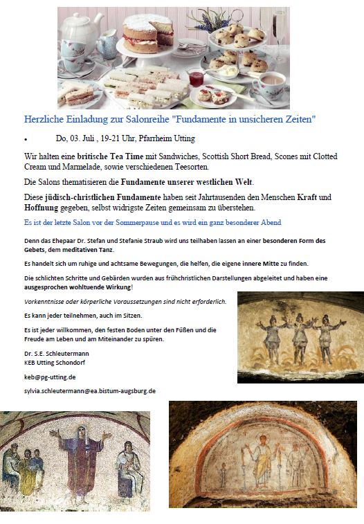 Herzliche Einladung zur Salonreihe "Fundamente in unsicheren Zeiten" Do, 03. Juli , 19-21 Uhr, Pfarrheim Utting Wir halten eine britische Tea Time mit Sandwiches, Scottish Short Bread, Scones mit Clotted Cream und Marmelade, sowie verschiedenen Teesorten. Die Salons thematisieren die Fundamente unserer westlichen Welt. Diese jüdisch-christlichen Fundamente haben seit Jahrtausenden den Menschen Kraft und Hoffnung gegeben, selbst widrigste […] |