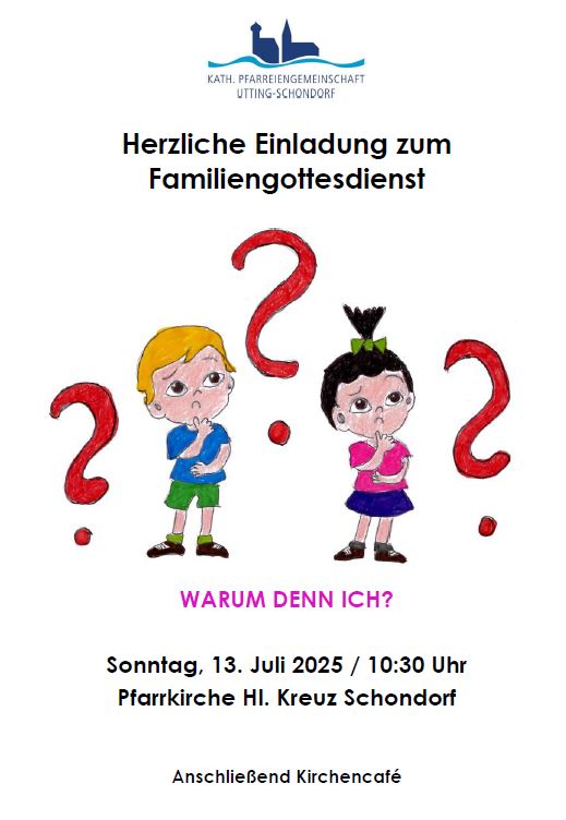 Herzliche Einladung zum Familiengottesdienst am 13. Juli um 10:30 Uhr in der Kirche Hl. Kreuz in Schondorf. Anschl. findet ein Kirchencafe statt.