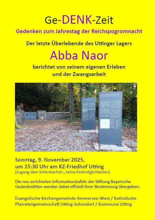 Ge-DENK-Zeit - Gedenken zum Jahrestag der Reichspogromnacht Der letzte Überlebende des Uttinger Lagers Abba Naor berichtet von seinem eigenen Erleben und der Zwangsarbeit. Sonntag, 9. November 2025, um 15:30 Uhr am KZ-Friedhof Utting (Zugang über Schönbachstraße, keine Parkmöglichkeiten) Die neu errichteten Informationstafeln der Stiftung Bayerische Gedenkstätten werden dabei offiziell ihrer Bestimmung übergeben. Evangelische Kirchengemeinde Ammersee-West […] |